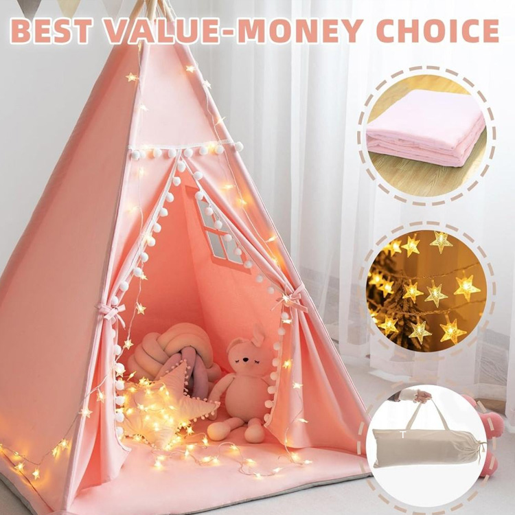 Teach Súgartha Cotton Canbhás Leanaí Tent Teepee for Kids le Mat.Your Ultimate Magical Play Space For Creative Adventures. Áirítear sa Phuball Teepee Canbhás Cadáis seo Mata Compordach, Soilse Réalta draíochtúla, agus Cás Iompraíochta Áisiúil. Foirfe Chun Súgradh Samhlaíoch a Spreagadh Agus Cuimhní Buan Óige a Chruthú.