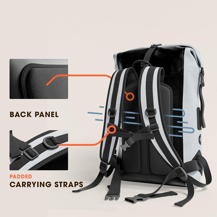 Áirítear leis sin strap ghualainn stuáilte compordach, lámha iompair iolracha, agus strapaí comhbhrú seachtracha chun ceangal slán a dhéanamh ar mhála droma nó ar árthaí uisce le linn gluaiseachta gníomhach.