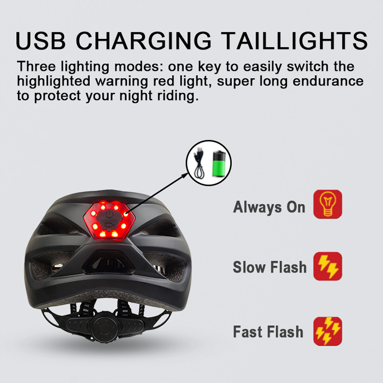 Gnéithe an dá soilse dearg in-athluchtaithe tosaigh bán agus cúil le modhanna éagsúla (fostaithe, gealánacha, strobe), ag soláthar infheictheacht 360 ° le haghaidh marcaíocht oíche. Cuireann an ceallraí USB-rechargeable suas le 6 uair an chloig d'oibriú leanúnach.