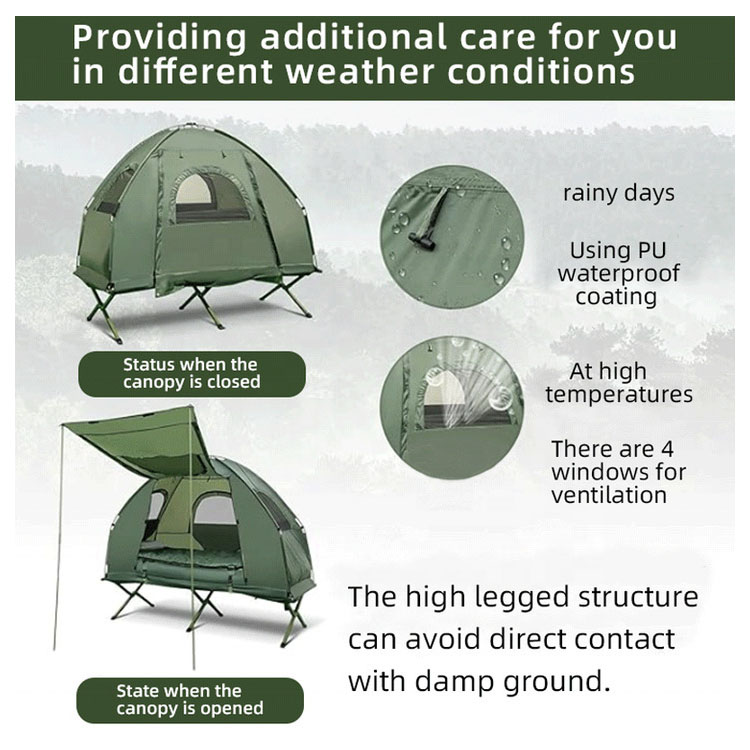 Tógtha le fabraic 210D Oxford agus sciath uiscedhíonach PU3000mm, soláthraíonn an puball seo cosaint iomlán i gcoinne báisteach throm agus taise talún, ag coinneáil an taobh istigh tirim go seasta i gcoinníollacha aimsire éagsúla.